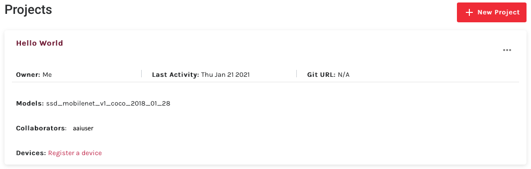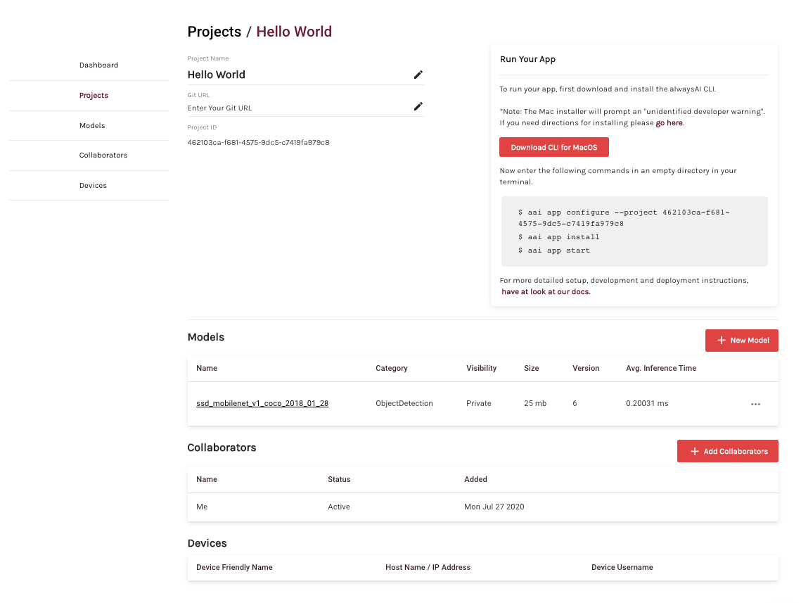 When you first create an alwaysAI account you’ll see a Hello World Project in your Dashboard. Projects are how you’ll organize your work; they contain the assets an application needs to execute.